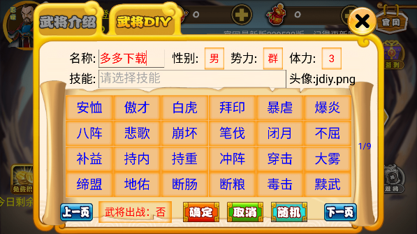 3、在这里你可以尽情的开始你的想法,不仅可以给你的武将起名字,还可以改变他的性别,增加他的“体力”,体力也就是血。除了这些超强的的功能外,你还能够给他们增加技能,总共有几十种技能等着你呢,可以说,制作完成后这就是完完全全的属于你一个人的将军!