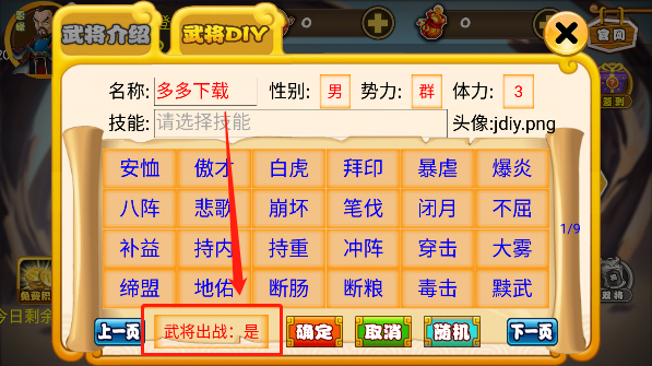 4、制作好武将之后,点击把下方的“武将出战:否”,把“否”换成“是”。
