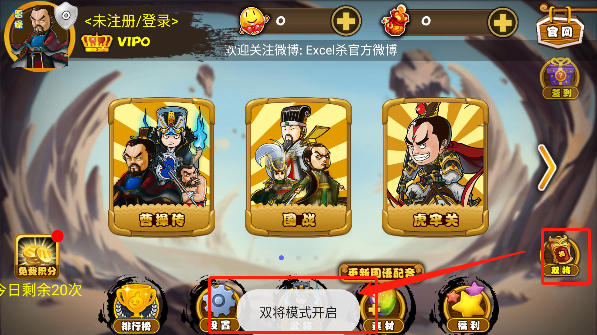 5、 然后再返回主页面,点击旁边的“双将”,把双将模式打开,就可以加入两名你制作的武将了。