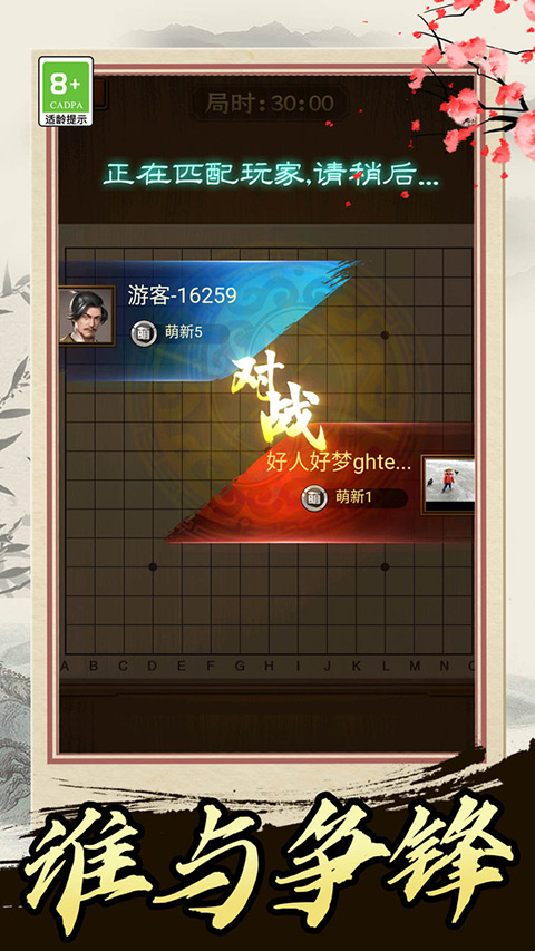 2、进入【对局界面】,对局时间为30分钟,左上方为自己,右上方为对手,按照黑棋先下的原则,开始落子,