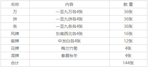 五门齐:牌型由3种花牌时序数牌、风、箭牌组成。