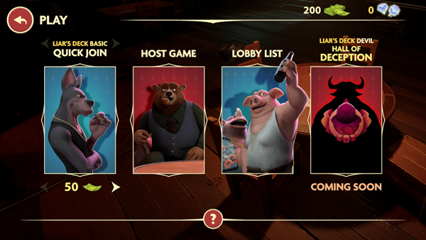 骗子酒馆手机版是一款类似俄罗斯轮盘的多人桌面棋牌游戏,英文名叫Liar's Bar,该游戏由Steam热门游戏《骗子酒馆》官方正版移植而来,其背景设定在一个阴暗的酒馆中,玩家在游戏中将和狐狸、河马、猎犬三个动物朋友玩一轮刺激的欺骗牌游戏,你需要通过撒谎和诈唬等技巧来获得最后的胜利。
