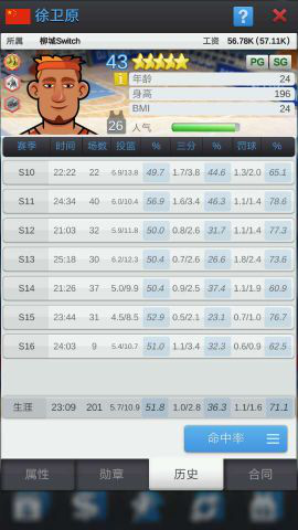 再说说小前锋身体素质要求吧,一般速度要求不用太快,但最好别低于60,力量最好也别低最好别低于55。