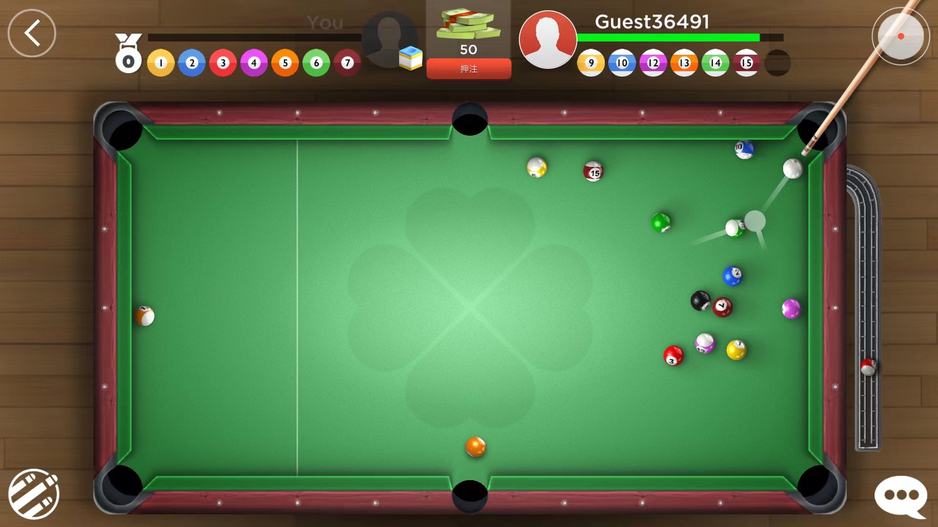 3、开球完成后,双方需要打进不同的球色,左上方为己方,右上方为对手,