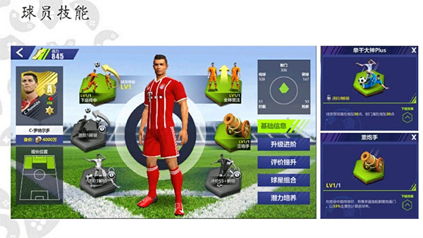 除此之外,球员的技能也是可以升级的。技能等级越高优势也就越大,例如罗纳尔多的“单干大神”技能在升级进阶后可增加30点的传球属性和射门属性,如果双方玩家技术水平难分高下,这30点的属性或许就能决定他们的胜负了,所以可以升级的时候可千万别忘了他。
