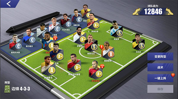 首先是阵型方面,游戏一上来默认的阵型是4-3-1-2这一攻击性很强的阵型,我们就一这一阵型为例,为大家来搭配球员!