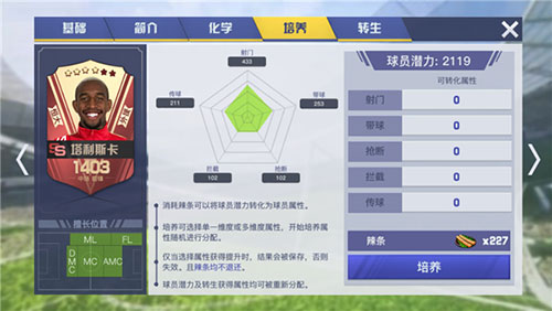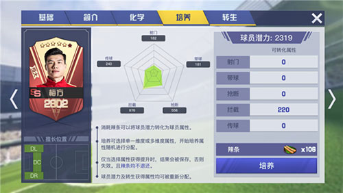 辣条是用来提升球员能力的重要道具,而球员的属性加成尽量选择跟自己洗的属性相同技能。球员技能也要搭配,SS卡尽量不选要双洗属性的。因为万金油就是平庸(部分SSS除外),中锋就是吃饼射门,所以只要洗射门就够了,中后卫就是拦截传球所以洗拦截,边锋都是带球突破型,边后卫就是抢断。