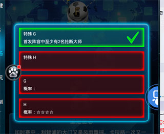这个就简单很多了,前往G的方式只有一个,就是首发阵容中至少两名球员类型为抢断大师的球员,下图为示例。而前往H的方法也只有一个,就是不满足特殊-G的要求!就可以前往H!