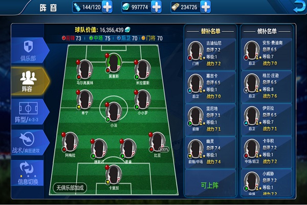 4、自己的球队阵容自定义安排位置,踢出你自己的特色风范。