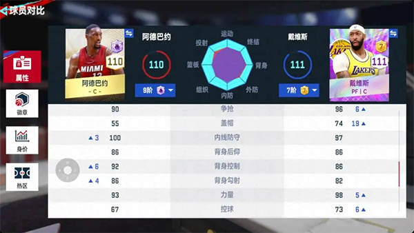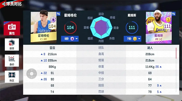 我们先来看下两个球员的面板数值对比: