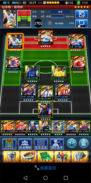 接下来给大家说一下球员的适应位置,图中斯特林的适应位置是整个前场还有中场的部分区域,球员只有在适应位置才能发挥全部能力,如果把一个5星的前锋球员放在后卫的位置上,他实际加成的战力还不如一个4星后卫,所以安排对位置也很重要,初期不会配可以自动编制。