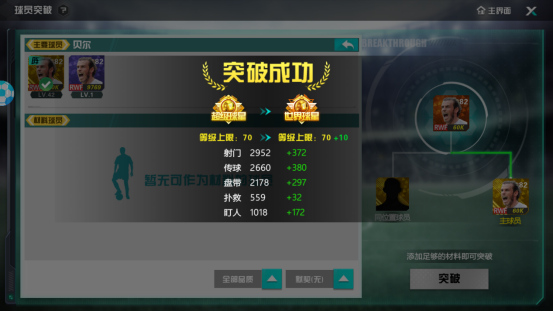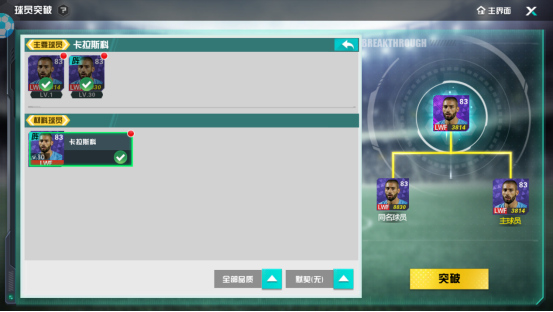 在选择相同球员或同位置球员后就可以点击确认进行突破啦!突破后会有一个成功突破的提示,经理人也可以留意一下哦~
