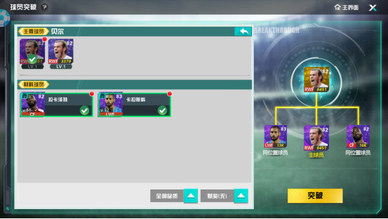 如果是阵容中的球员,也会有系统提示是否确定突破,要记得检查有没有不想被作为材料突破的球员,就算手误点了确定也没有关系,系统会为经理人把突破住球员和材料球员罗列出来,没有问题就确定一键突破,完成进阶啦。