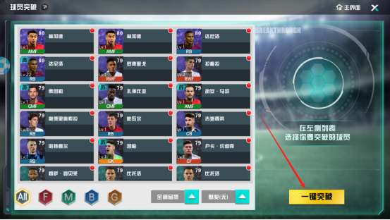 那么当球员大部分都满足突破条件,经理人又不知道如何选择的时候,也是可以使用界面右下角的一键突破功能,由系统来替经理人进行突破选择的。不必担心,本身是联赛球星的球员是不会被放入到一键突破的选项中的。为了快速超越球员极限提升战力,也可以试试一键突破哦~