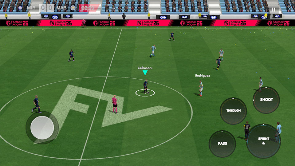 6、比赛过程中,使用左下方虚拟摇杆控制球员跑位移动,右侧行动按键支持传球、冲刺、拦截与射门等操作,结合手势指令释放高级技巧,依靠默契配合与战术执行赢得胜利。