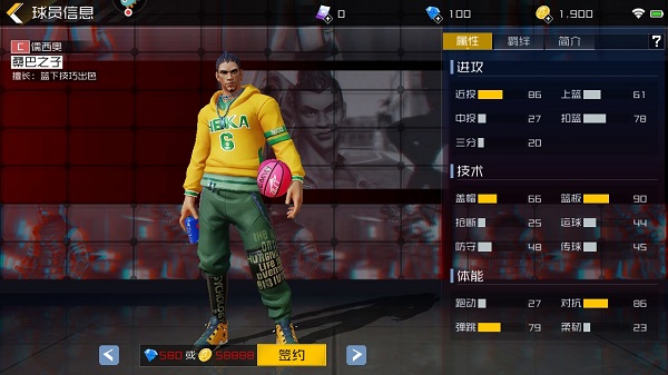 该角色可以通过首冲获得,其属性不难看出相当灵活,尤其是90点的篮板属性,所以在实战中尽量保证在篮下阻截对面中锋的投篮,再加上特性技能的效果,可以在盖帽失败的时候,也能继续起跳参与篮板球的争夺。
