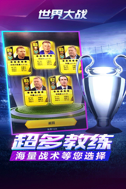 世界大战欧冠英雄是一款非常好玩且有趣的真实欧冠球员养成类游戏,在游戏中,玩家可以自由的招募欧洲联赛明星球员,并根据自己的想法,自由的搭配组建一支强大的球队,参加各种不同的联赛,战胜所有的球队,取得最终的冠军,站到足球之巅。而且,在游戏中,每位球员也都有各种的特色和技能,玩家需要通过了解它们各自的能力,组建不同的阵容队伍,或进攻或防守,完全由玩家的策略而定。此外,每位球员都可以通过训练、进阶、升级、比赛等来提升自己的实力,所以玩家可以雇佣世界顶级教练为自己的球队服务,并且建造高端的设施,为球员的训练升级提供更好的场地,同时还需要不断的参赛,以此赢得更多的奖励好提升自己球员的等级。ps:本次小编带来的是世界大战欧冠英雄手游腾讯版,此版本能使用微信、QQ、手机等账号登录进入游戏,玩家上线之后即可领取腾讯和官方提供众多福利,让你更轻松的畅玩游戏,有需要的玩家快来下载试玩吧。